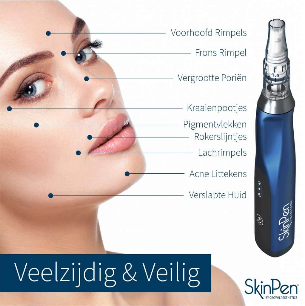 De SkinPen is krachtiger, preciezer en veiliger dan ooit tevoren! De naalddiepte kan in tegenstelling tot veel andere micro-needling systemen op de naald zelf worden ingesteld en gaat hierdoor nooit dieper of oppervlakkiger in de huid dan ingesteld. Daarnaast is de SkinPen het enige micro-needling systeem waarmee bewezen zuivere microkanaaltjes gemaakt worden. Dit is beide uniek en de veiligheid van de behandeling is hiermee gewaarborgd.